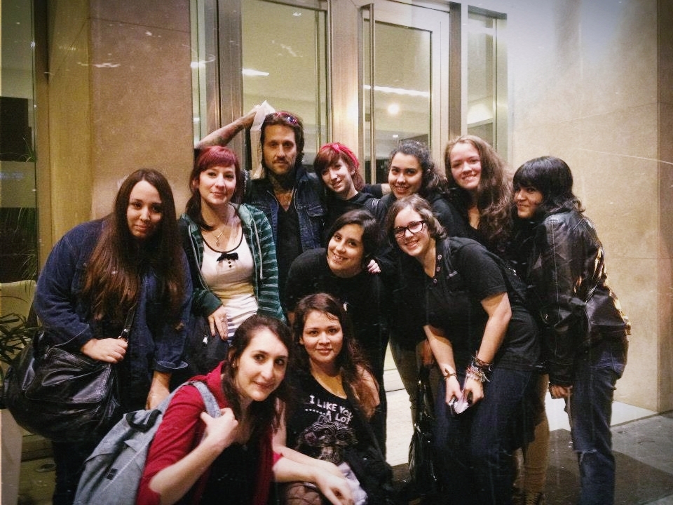 Luego de la foto con Bert, la mayoría se fue, y solo quedamos 10 personas fuera del hotel. A las dos de la mañana más o menos, el señor Quinn ♥ bajo a hablar con nosotros. En realidad iba a llamar a su hermosa esposa, pero se quedó con nosotros (incluso a pesar del frío que hacia). Antes de hablar hicimos el protocolo de sacar fotos y que nos firmara un par de cosas. Cuando termino de sacarse fotos le dije si lo podía abrazar (yep, no iba a dejar pasar esa oportunidad, tenía que pedirlo) y me dijo que sí, fue el abrazo más lindo del mundo. Luego empezamos a hablar, e incluso cuando no sabíamos que decir (por nervios más que nada jaja), el sacó temas, un encanto este hombre. Hablamos de ufo's (ovnis), Nirvana, Foo Fighters, nos pregunto si podíamos conseguir cd's de ellos acá y le dijimos que no. Con lo cual dijo que iba a ver que podía hacer. Nos recomendó escuchar Dead Sara, una banda que de hecho yo conocía y escucho (la cantante tiene una voz genial). Anyway, hablo con nosotros unos 40 minutos. Nos preguntó quien había bajado de la banda, y le dijimos que Jepha y Bert, que queríamos ver a Dan. Pero nos explicó que a Dan no le gustaban mucho las fotos ni las multitudes. Luego nos dió un apretón de manos a cada uno y se fue a dormir. He aquí la foto de ese momento cuando apenas salió.